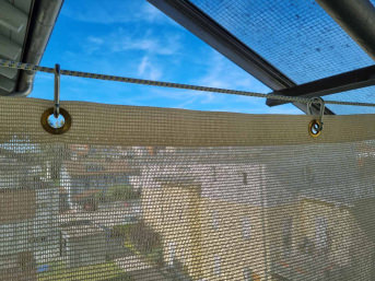 I hung the shade net in my cat net. The carabiners are very practical and easy to use. I have a small south-facing balcony. This was the best method because it is difficult to put up an umbrella. It is very practical because I can hang it up and take it down depending on the intensity of the sun. translated, original text: "Ich habe das Beschattungsnetz in mein