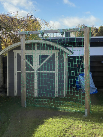 Wir haben ein Holzgestell im Garten, an dem früher geschaukelt wurde. Jetzt wurde es kurzerhand mit dem Netz zum Fußballtor umfunktioniert. Klappt super."