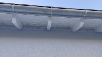 The net was installed after the gable of the house had been repainted. The exposed roof beams were always an invitation to build birds' nests. It was attached using brass hooks. It effectively protects against birds flying in. All attempts with spikes or similar have so far been unsuccessful. translated, original text: "Das Netz wurde nach Neuanstrich des Hausgiebels angebracht. Die baubedingt freiliegenden Dachbalken waren immer eine Einladung, Vogelnester zu bauen. Die Befestigung erfolgte mit Messinghaken. Es schützt effektiv vor Vogeleinflug. Alle Versuche mit Spikes o.ä. waren bisher nicht erfolgreich."