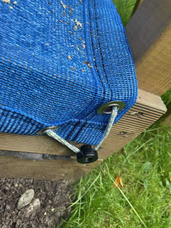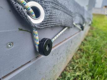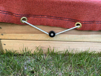 We tighten our new sandpit cover with a rubber cord, which we attach to these PE knobs. It's a breeze and holds the cover securely in place, windproof.