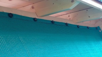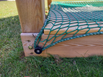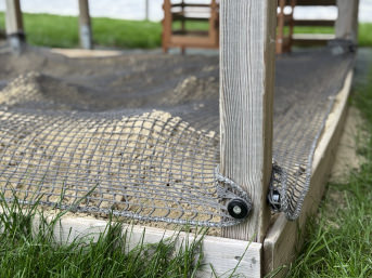 With the buttons we found a great solution to stretch the safety net over the sandpit. translated, original text: "Mit den Knöpfen haben wir eine prima Lösung gefunden, um das Sicherungsnetz über den Sandkasten zu spannen."