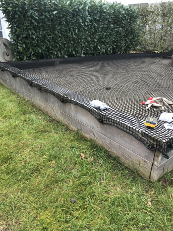 We have a small raised wooden pond with a few goldfish, which unfortunately were repeatedly visited by a grey heron. Now we finally have the perfect solution: a leaf protection net, perfectly attached with the PE buttons. translated, original text: "Wir haben einen kleinen Hochteich aus Holz mit wenigen Goldfischen, die leider immer wieder von einem Graureiher heimgesucht wurden. Jetzt haben wir endlich die perfekte Lösung: ein Laubschutznetz, perfekt angebracht mit den PE-Knöpfen."