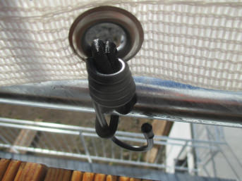Tension loops for attaching the windbreak net to the railing - can be attached very easily and hold extremely well! translated, original text: "Spannschlaufen zum Befestigen des Windschutznetzes am Geländer - lassen sich sehr gut befestigen und halten extrem gut!"