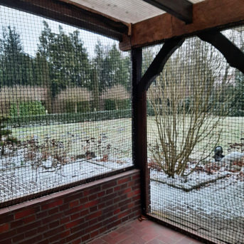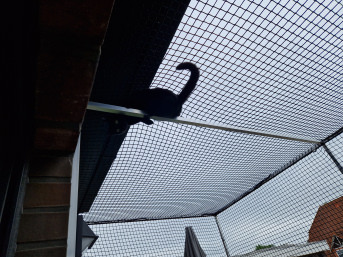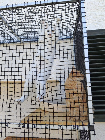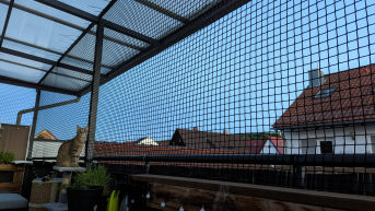 The reason for the net is to allow my cat, who suffers from epilepsy, to go outside at least a little. He used to be an outdoor cat and spent a lot of time outside, but now he can at least go out onto the terrace. I've made it as comfortable as possible there. Now he can be outside with his little sister and I can sit outside too. The net was easy to attach and it's so good that it can even withstand climbing up; the cat weighs 4kg. My cats love using their outdoor space and can go outside all day long, even when it's raining, without getting wet. I'm happy with the result, especially as the movable middle section means I can go into my garden to water flowers or mow the lawn. translated, original text: "Der Grund für das Netz ist es meinem an Epilepsie leidenden Kater wenigstens ein wenig Ausgang zu ermöglichen. Er war vorher Freigänger und sehr viel draußen, nun kann er wenigstens bis auf die Terrasse, ich habe es dort so gemütlich, wie möglich gemacht. Nun kann er draußen sein mit seiner kleinen Schwester und auch ich kann draußen sitzen. Das Netz war einfach zu befestigen und es ist so gut, das es sogar ein Hochklettern aushält, der Kater wiegt 4kg. Meine Katzen nutzen ihren Freiraum sehr gerne und den ganzen Tag lang, sogar bei Regen sind sie draußen ohne nass zu werden. Ich bin zufrieden mit den Ergebnis, zumal ich durch das bewegliche Mittelteil auch in meinen Garten gehen kann, um Blumen zu gießen oder Rasen zu mähen."