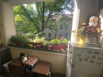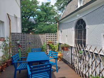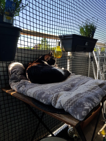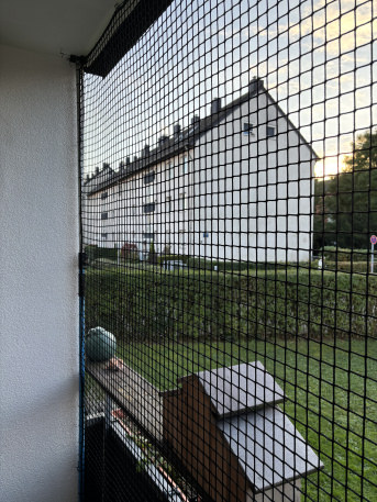 I have my nets to protect my cats, even if they themselves may see it as a kind of Alcatraz. But with the nets I was able to secure two balconies and a terrace of around 40 square meters, they can no longer be run over, but they have plenty of space to run around. On the terrace I have green nets, which go well with my neighbor's park, and on the balconies I have four-colored nets, which look cheerful and friendly both inside and out.