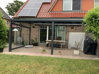 Since we are in the situation of having a "trapped" area on the terrace directly adjacent to the terrace doors (covered), we wanted to use the nets between the supporting beams of the roofing.