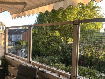In order to be able to use our large balcony with our house cats, we had to make it "cat-proof". It would have been quite easy with a protective net made to measure, metal rods, screws, dowels and cable ties. But our landlord doesn't allow any drilling on the facade or on the balconies. So we had to find another solution. The result is a frame made of 30 mm V2A square tubes with connecting sleeves, attached to the balcony railing with clamps. The 3 extra strong cat protection nets made to measure with a surrounding edge are attached to the frame and the balcony railing with (really a lot of) stainless steel cable ties. The nets are extremely stable, they are not only a piece of safety for our cats. My wife, who had not dared to approach the balcony railing due to her fear of heights, now goes right up to the net and feels safe. Our roof terrace will be completed shortly and we will be ordering the cat protection nets for it now. With the appropriate installation, the custom-made protection nets not only provide a safe solution for our four-legged roommates, but also a visually appealing one. translated, original text: "Um unseren großen Balkon gemeinsam mit unseren Stubentigern nutzen zu können mussten wir ihn "katzensicher" machen. Wäre auch mit einem Schutznetz auf Maß, Metallstangen, Schrauben, Dübeln und Kabelbindern recht einfach gewesen. Nur lässt unser Vermieter an der Fassade und auf den Balkonen keine Bohrungen zu. Also war eine andere Lösung zu suchen. Das Ergebnis sind Rahmen aus 30 mm V2A Vierkantrohren mit Verbindungsmuffen, mit Klemmbügeln am Balkongitter befestigt. Die 3 extra starken Katzenschutznetze nach Maß mit umlaufender Abschlusskante sind mit (wirklich sehr vielen) Edelstahl-Kabelbindern am Rahmen und dem Balkongitter befestigt. Die Netze sind außerordentlich stabil, sie sind nicht nur ein Stück Sicherheit für unserer Katzen. Meine Frau, die sich aufgrund Ihrer Höhenangst nicht an das Balkongitter vorgewagt hatte, geht nun bis an das Netz heran und fühlt sich auch gesichert. Unsere Dachterrasse wird in Kürze fertiggestellt und wir werden jetzt schon dafür die Katzenschutznetze bestellen. Mit den Schutznetzen nach Maß gelingt bei entsprechender Montage nicht nur eine sichere Lösung für die vierbeinigen Mitbewohner, sondern auch eine optisch ansprechende."