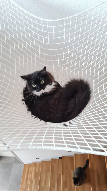 The safety net in white / 2800x4000mm thick was the optimal solution, both visually and in terms of workmanship, with a thick edge all around it can be stretched very well. I chose load securing rods to clamp to the ceiling and floor. Even the cat climbing on the stretched net works wonderfully.