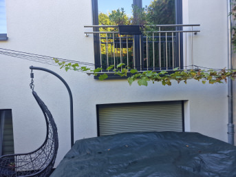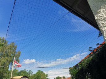 The other net has two functions. On our terrace we have a large window facing the arcade, which unfortunately was underestimated during planning, as there is now a dead bird lying there every two weeks. We have now put up a climbing net here too and let ivy grow up the middle, which also gives the birds the impression that they can no longer fly through there.