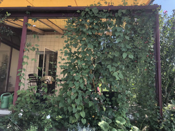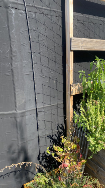 The net is intended as a climbing aid for a mixture of annual plants and permanent vegetation and will hopefully serve as a privacy screen in the near future.
