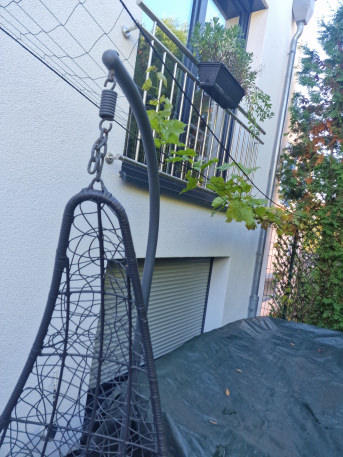 Goal: green sun protection over our terrace area. The wild vine should climb on it. We decided to use vines because the leaves fall off in the autumn and the window underneath is not completely dark in the winter. This version is also storm-proof because the air can pass through the net, unlike a sun sail.
