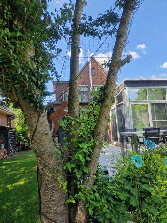 I put up the net in the spring so that I could guide the clematis into the tree and it would be able to hold on better. The net is sturdy and looks good, it meets my expectations. I think it will have grown in in 1-2 years. I'm already thinking about where I could use the next net. translated, original text: "Ich habe das Netz im Frühjahr angebracht, damit ich die Clematis in den Baum leiten kann und sie sich dort besser festhalten kann. Das Netz ist stabil und sieht gut aus, es entspricht meinen Erwartungen. Ich denke, in 1-2 Jahren wird es eingewachsen sein. Ich überlege schon, wo ich das nächste Netz gebrauchen könnte."