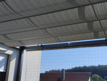 The dimensions were a good fit and installation was easy. This is already our second project with Safetynet365. translated, original text: "Ziel: begrünter Sonnenschutz über unserem Terassenbereich. Daran soll der Wilde Wein ranken. Entscheidung für Wein deshalb, weil im Herbst das Laub abfällt und das Fenster darunter nicht komplett dunkel ist im Winter. Ausserdem ist diese Variante sturmsicher, da die Luft durch das Netz kann im Gegensatz zu einem Sonnensegel.