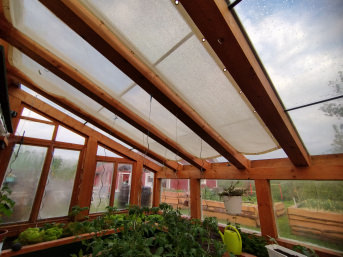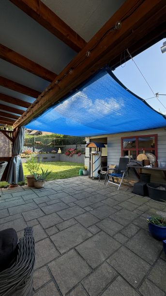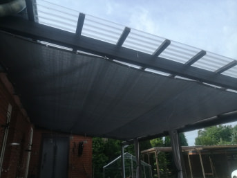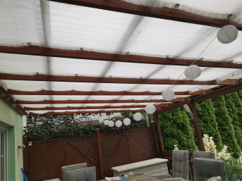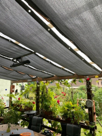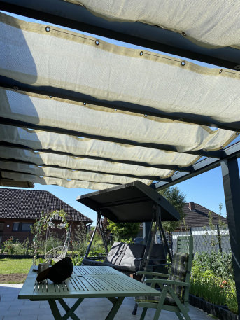 We use the shade nets to shade our winter garden and our pergola. For the pergola, we had individual strips made to measure between the beams and attached them underneath with rubber bands and screw hooks. We are very happy with the nets. We think the ratio between shading and light transmission is perfect, so that it doesn't get too dark underneath, even when it's only cloudy. I can only recommend the nets. translated, original text: "Wir nutzen die Schattiernetze zum Abschatten unseres Wintergartens und für unsere Pergola. Bei der Pergola haben wir einzelne Streifen zwischen den Balken auf Maß anfertigen lassen und untenliegend mit Gummis und Schraubhaken befestigt. Wir sind mit den Netzen sehr zufrieden. Das Verhältnis zwischen Abschattung und Lichtdurchlass, damit es darunter nicht zu dunkel wird, auch wenn es nur bewölkt ist, finden wir perfekt. Ich kann die Netze nur empfehlen."