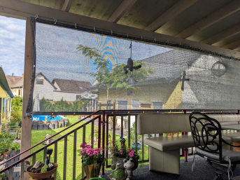Dirk Peters translated, original text: "Wir verwenden die Schattiernetze auf unserer sonnigen Veranda. Aufmaß und Bestellung haben problemlos funktioniert, und das Material macht einen guten und langlebigen Eindruck. Alles ist sauber vernäht und die Führungsringe sind stabil. Das ganze läuft bei uns auf dünnen Stahlseilen und die Netze sind mit runden Karabinerhaken eingehängt.