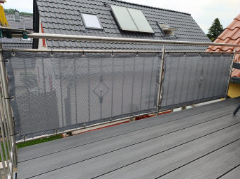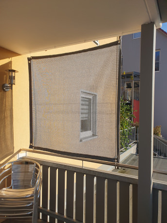 My loggia is almost 8 meters long and faces south-west. I was looking for both a privacy screen and a sunscreen; the product should be translucent but still block out the radiation, be weatherproof and affordable. I have found the ideal product. The net has wonderful quality and workmanship, the special size arrived exactly as ordered, they are very nice and match the color of the net perfectly. I used the net as a curtain, i.e. mounted it on the top and bottom side of the loggia with plasticized steel cables (3mm) and cable tensioners on my railing and the crossbars with hose clips and beam angles. The result is exactly how I wanted it. Great! I can absolutely recommend the product! translated, original text: "Meine Loggia ist knapp 8 Meter lang und südwestseitig. Ich suchte sowohl nach einem Sichtschutz als auch nach einem Sonnenschutz, das Produkt sollte zwar lichtdurchlässig sein, dennoch die Strahlung eindämmen, wetterbeständig und leistbar sein. Ich habe das ideale Produkt gefunden. Das Netz hat eine wunderbare Qualität und Verarbeitung, das Sondermaß kamen genauso wie bestellt, die Ösen sind sehr schön und passen perfekt zur Netzfarbe. Ich habe das Netz als Vorhang verwendet, d.h. an der oberen und unteren Seite der Loggia mit plastifizierten Stahlseilen (3mm) und Seilspannern an meinem Geländer und den Traversen mit Schlauchspangen und Balkenwinkel montiert. Das Ergebnis ist genau so geworden, wie ich das wollte. Super! Ich kann das Produkt absolut empfehlen!"