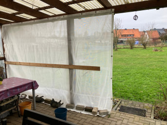 Ground-level terrace facing the windy side. Stabilized in the middle with a board, it is now dimensionally stable even in stormy weather and keeps rain and probably snow away. Because it is white, it does not darken. It is transparent, so you can still see the area behind it. First impression - a good decision at a reasonable price. Thank you. translated, original text: "Ebenerdige Terrasse mit Ausrichtung zur windlastigen Wetterseite. In der Mitte mit einem Brett stabilisiert ist sie nun auch bei stürmischen Wetter formstabil und hält Regen und sodann vermutlich auch Schnee fern. Da sie weiß ist, dunkelt sie auch nicht ab. Sie ist blickdurchlässig, so dass man den dahinterliegenden Bereich trotzdem gut einsehen kann. Dem ersten Eindruck nach - eine gute Entscheidung zu einem angemessenen Preis. Danke."