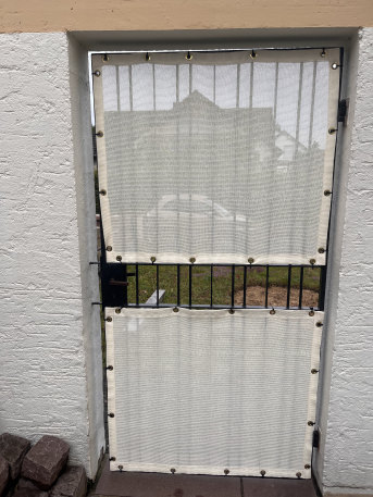I use the netting as a privacy screen for an old metal garden gate. This prevents anyone from seeing into the garden from the street. The privacy screen is good, and the fabric is just right for wind loads. I secured the netting with plastic cable ties. Time will tell if these cable ties are suitable or if they need to be secured with wire or something similar. I'm very satisfied with the netting itself. translated, original text: "Die Netze dienen bei mir als Sichtschutz bei einer alten Metallgartentüre. So kann man nicht mehr von der Straße in den Garten sehen. Der Sichtschutz ist gut, und auch mit der Windlast ist das Gewebe genau richtig. Ich habe die Netze mit Kunststoffkabelbindern fixiert. Hier muss die Zeit zeigen, ob diese Kabelbinder geeignet sind und oder doch eine Befestigung mit Draht o.ä. erfolgen muss.