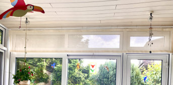 As you can see in the photos, the safety nets serve as sun protection for our conservatory. The advantage of the mobile safety nets is that they can be installed as needed starting around June (suction cup). For added convenience, we ordered them with a permanently sewn lead cord. Eyelets were attached at the top. Side eyelets allow the safety nets to be joined together with cable ties, leaving only minimal gaps. This way, they fall down weighted down, and nothing can happen in wind or storms. We are very satisfied with our solution to the problem, as the awning is no longer sufficient in the high temperatures. The safety nets also serve as a privacy screen in the conservatory. You can see out well, but the view isn't as unobstructed. translated, original text: "Wie auf den Fotos zu sehen dienen uns die Schutznetz als Sonnenschutz für unseren Wintergarten. Der Vorteil der mobil angebrachten Schutznetze ist, dass man sie erst bei Bedarf ab ca. Juni anbringen kann (Saugnapf) Wir haben sie für den besseren Fall mit einer fest vernähten Bleischnur bestellt. Oben wurden Ösen angebracht. Seitliche Ösen ermöglichen es, dass man die Schutznetze mit einem Kabelbinder zusammen fügen kann, so dass nur minimale Lücken entstehen So fallen diese beschwert nach unten und bei Wind oder auch Sturm kann nichts passieren. Wir sind sehr zufrieden mit unserer Problemlösung, da die Markise bei den hohen Temperaturen nicht mehr ausreicht. Zudem dienen die Schutznetze auch als Sichtschutz im Wintergarten. Man kann gut hinaussehen aber der Einblick ist nicht so frei."
