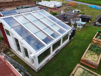 We really like the terracotta color and it fits perfectly with the style of the house and the surroundings. The carport has become an attraction for passers-by, many people look with interest at what has been created there. translated, original text: "Die Idee war, ein begrüntes Carport zu bauen. Bis die Pflanzen die nötige Höhe und Dichte erreichen, dauert es aber noch ein paar Jahre. Außerdem nutzen etliche Vögel das Holzgestell aus Aussichtsplatz - mit entsprechenden Folgen für das Auto...