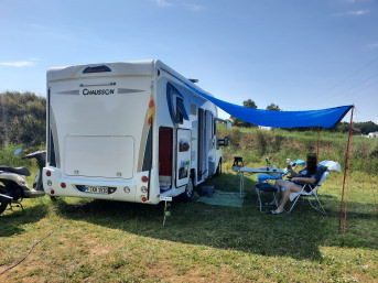 This also allows the rain to get through, which is not so bad in the south. It rains briefly, no pockets of water form and it dries again in no time. translated, original text: "Wir haben den Sonnenschutz als Ersatz für ein Markise am Wohnmobil gekauft. Er ist durch seine Struktur winddurchlässig und daher am Meer und in sehr windigen Gegenden nicht so anfällig wie dichte Planen. -Sturmerprobt - Außerdem staut sich die Wärme nicht so sehr darunter als bei Markisen.