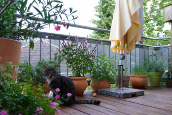In May I moved into a new apartment that has a nice balcony, but a railing made of vertical metal bars. On the one hand, I was bothered by the fact that you could see the balcony so directly, but my (apartment) cats were also tempted to simply jump through the space between the bars and down into the garden. A neighbor gave me the tip to cover the railing with one of your safety nets.