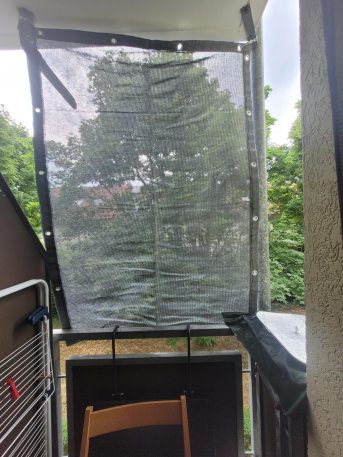 I can recommend protective nets 100%. translated, original text: "Ich bin seit Jahren begeisterte Balkongärtnerin. Obst und Gemüse stehen hoch auf der Liste. Erst hatten wir eine Bespannung vom Baumarkt, welche sich durch ungeeignete Maße nicht straff anbringen lies und schlaff da hing und bei Wind extreme Geräusche hervorgebracht hat. Nächsteres war eine Bambusbespannung. Die sah genau 2 Jahre nett aus, hatte aber den Nachteil das Tomaten & Co nicht genügend Licht bekommen haben. Seit einigen Wochen haben wir nun den Sichtschutz von Schutznetze. Genau gemessen und auf den Zentimeter genau kamen blitzschnell die Netze hier an. Was soll ich sagen: Es kommt genug Licht hindurch beim Gemüseanbau ohne das etwas verbrennen kann, optisch sehr ansprechend, die Privatsphäre ist gesichert, das hässliche Balkongitter schaut sich weg und vor allem es liegt bündig an der Wind hat keine Chance es flattern zu lassen.