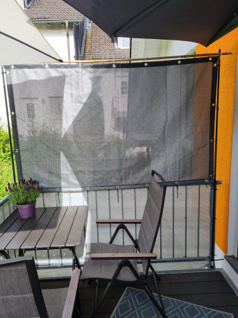We also have a small balcony on the east side, for which I ordered a cheap ready-made product at the same time. After about three years, however, it had frayed in places and was somewhat discolored/molded, so I had to throw it away. I've now ordered the privacy screen from Safetynet365 GmbH for it as well, and it was delivered again on time and in the above-mentioned quality. Perfect! translated, original text: "Ich bin super zufrieden mit dem vor ein paar Jahren gekauften Sichtschutznetz für unsere Terrasse/Balkon (Südseite). Wurde pünktlich geliefert und mit genau den Maßen wie bestellt. Die Ösen und Ränder sind sauber verarbeitet und alles sieht auch heute noch unverändert aus, kein Ausfransen, kein Ausbleichen oder sonstige Verfärbung! Den Schattierwert 90% finde ich ideal, er gibt Sichtschutz, gestattet aber noch das Erkennen von Formen.