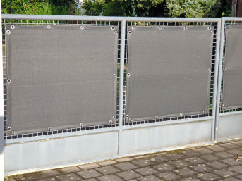 Privacy protection on the fence of our lake bed. We have covered the wire mesh fence along the street with the tailor-made privacy net with eyelets. The eyelet spacing of 30 cm has proven to be effective. We were able to attach the net quickly and easily using cable ties. The price of the net was several times higher than the usual net sold by the meter, but the effort was worth it. The appearance is perfect and the time required to cover it was a fraction of what our neighbor had to spend. translated, original text: "Sichtschutz am Zaun unseres Seegrunds. Wir haben den Maschendrahtzaun entlang der Straße mit dem maßgeschneiderten und mit Ösen versehenen Sichtschutznetz bespannt. Der Ösenabstand von 30 cm hat sich bewährt. Mit Kabelbinder konnten wir das Netz gut und auch zügig befestigen. Der Preis des Netzes war zwar ein mehrfaches des handelsüblichen Meterware, der Aufwand lohnt sich aber. Das Aussehen ist perfekt und der Zeitaufwand für die Bespannung war ein Bruchteil dessen im Vergleich mit dem Aufwand des Nachbars."