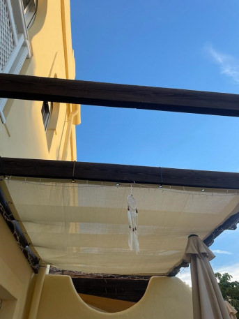 It gets too warm very quickly on our terrace, so we looked for shade nets that are also available in custom sizes (we have a hanging lamp above the dining table and we were looking for a solution for that too) Tadaaaaa.......found it here!