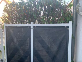 We have two of the PRIVACY NETS described here - 90% SHADING VALUE in silver in use: I am completely delighted with the workmanship. The dimensions are correct, the holes and seams are neatly finished. I had imagined the material and color to be a little finer and lighter - I immediately thought of a chain mail, but it serves its purpose as desired and expected.