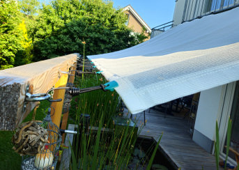 Instead of screws, I decided to use clips because they can be attached to any part of the pond protection film and hold securely. translated, original text: "Statt für Ösen hab ich mich für die Clips entschieden, da sie an jeder Stelle der Teichschutzfolie befestigt werden können und bombenfest halten."