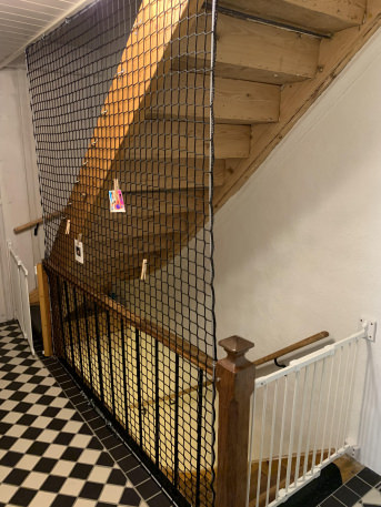 I used the product reviewed here for a safety net in an old town house, see photo. The construction may seem trivial, but it is not. In this house there is not a single right angle and no two parallel walls. The previous, complex and careful measuring, together with the very helpful tips from your customer service (even with my small quantity), were worth it. My nephew is delighted with it and is now no longer exposed to any dangers in the stairwell.