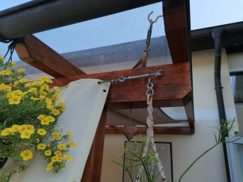 Stretching protective net on terrace translated, original text: "Spannen von Schutznetz auf Terrasse"