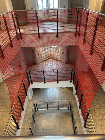 Safety net for ceiling work close to the staircase!!! translated, original text: "Schutznetz für Deckenarbeiten dicht am Treppenhaus!!!"