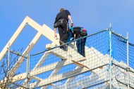 The special nets are mounted on roof safety scaffolds or standard facade scaffolding – which is why they are often called “roof safety nets” or “scaffolding nets”. They must thereby completely enclose the different scaffolding levels, i.e. from one toeboard to the next.