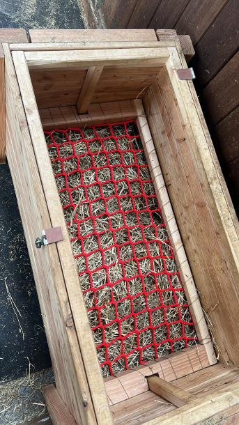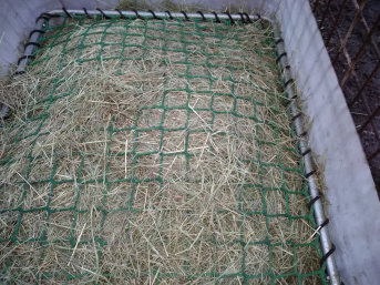 The net is stretched over a homemade hay rack and secured with snap hooks.