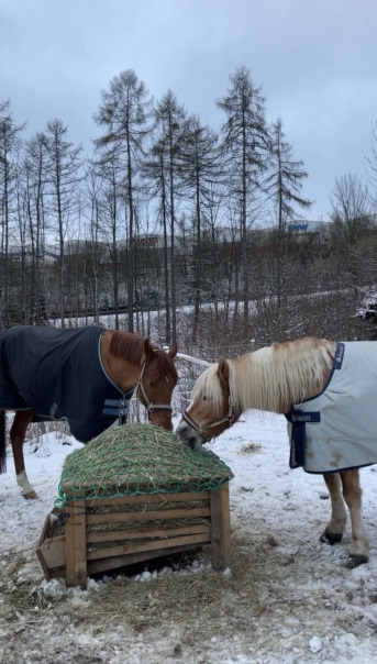 So geht uns deutlich weniger Heu verloren & die Pferde haben mehrere Stunden etwas zutun & genug Heu für den ganzen Tag!