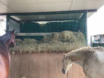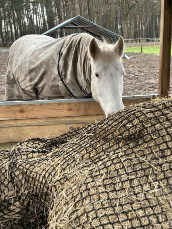I was looking for a suitable net to optimize the hay intake from the rack. The horses should be able to get to the feed without frustration, but should not spread it all over the paddock.