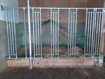 fixiert. Seit Verwendung der Netzen fressen die Pferde langsamer und das Raufutter wird weniger auf der Fressfläche verteilt, da es durch die Netze zurück