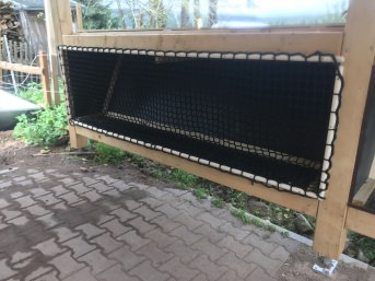 Das Netz kam ein guter Verarbeitung in den richtigen Maßen an und ließ sich wunderbar am bereits vorhandenen Rahmen befestigen. Auf den Bildern sehen Sie Teile des Rahmens und unsere Ponys beim Abendbrot."