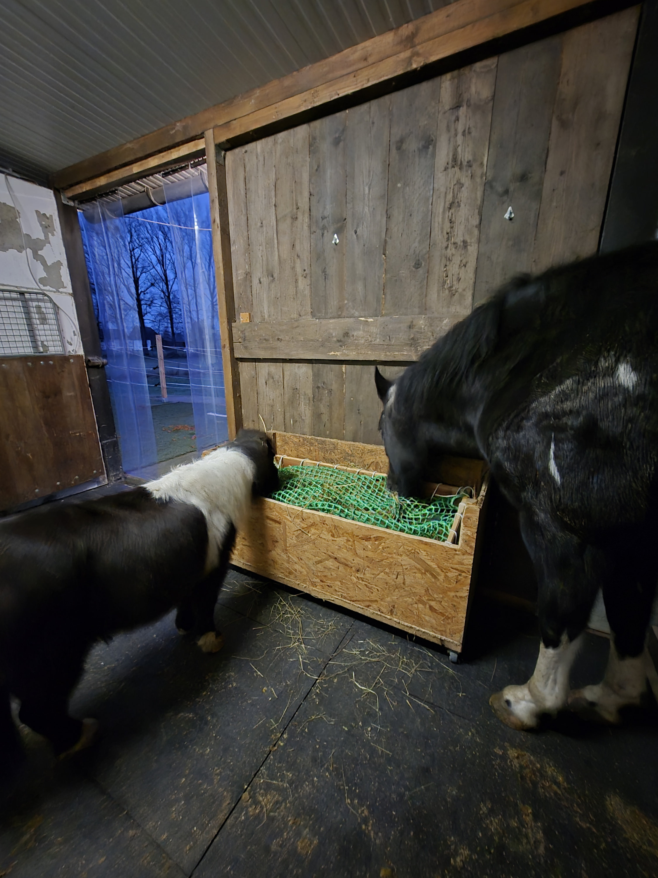 We stretched the tailor-made nets onto homemade wooden frames and placed them over the hay in our horses' feeding racks. The nets mean they have to work a little harder to eat the hay and they are kept busy for longer.