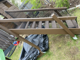 Zusätzlich zum Netz haben wir Spanngurte (Befestigungsriemen) und Erdnägel gekauft. Mit den Spanngurten ist das Netz links an einem Pfosten, oben an einer Strebe und rechts an einer Dachrinne befestigt. Am Boden wird es von den Erdnägeln fixiert (das Foto wurde vorher aufgenommen, daher nicht zu sehen).