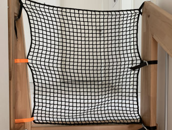 We bought a safety net for a loft bed. The mesh size of the net is perfect so that our daughter's foot cannot get caught in it at night. The ends are also reinforced. Overall, the net seems very stable. Our daughter even hung on it, but the net returned to its original shape.
