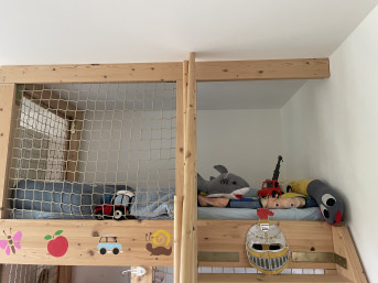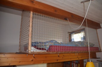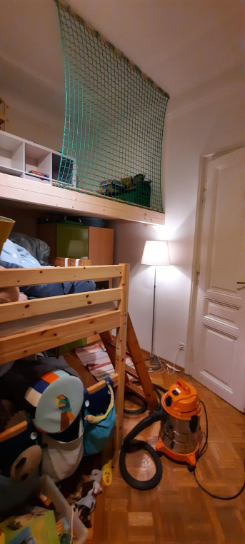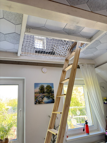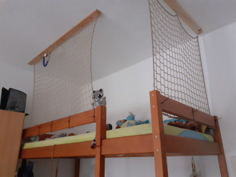 Now the test - two children, one four year old and one two year old, throw themselves against the nets every day, hang on them and sleep peacefully. Our son has slept up there from the first night - now he feels safe. The second advantage is that it is hardly visible. The room seems bigger and smaller than feared.