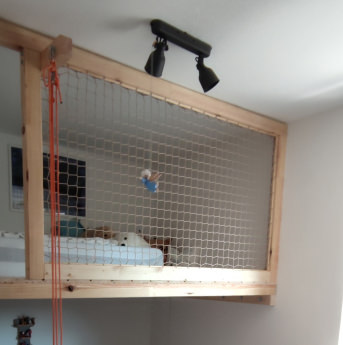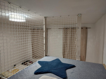 Installation is also very simple and relatively quick. For the loft bed, I attached the net at the bottom with a rope from this side and to the ceiling with screw hooks. On the balcony, I attached the net to the balcony railing at the bottom with cable ties and to a taut steel cable at the top with cable ties.