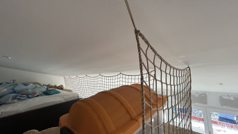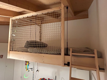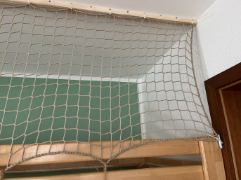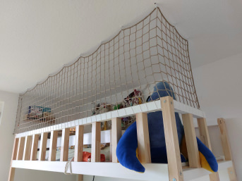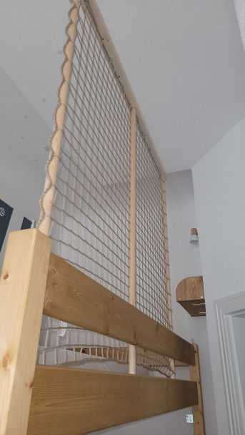 Here the net was used as a fall protection for a loft bed and is perfectly suited for this purpose. Ordering and delivery were easy and punctual, the assembly was perfectly correct and beautifully finished. I mounted the net at the top and bottom with beech rods (20 mm diameter) and countersunk screws, which worked very well. I and especially my customers are very satisfied and I will certainly use this source again if necessary. translated, original text: "Hier wurde das Netz als Absturzsicherung bei einem Hochbett verwendet und ist dafür perfekt geeignet. Bestellung, Lieferung waren einfach und pünktlich, die Konfektionierung ist maßlich korrekt und schön verarbeitet. Ich habe das Netz oben und unten mit Buchenrundstäben (20 mm DM) und Ösenschrauben montiert, was sehr gut funktionierte. Ich und vor allem meine Kunden sind sehr zufrieden und ich werde bei Bedarf sicher wieder auf diese Quelle zurückgreifen."