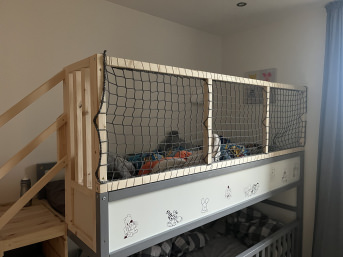Mit diesen Schutznetzen haben wir die perfekte Lösung. Unser Sohn hat noch eine kleine Plattform bekommen - zum Lesen und als Ablage. Mit zwei Netzen haben wir die ganze Fläche abgesichert.