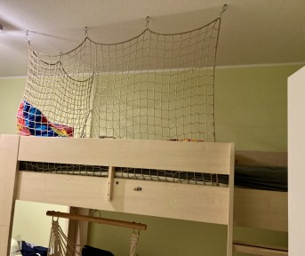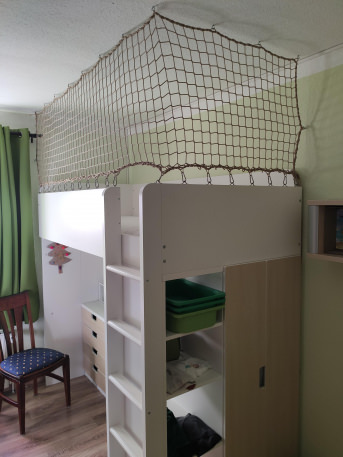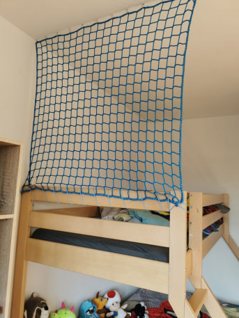 We attached the net between the loft bed and the ceiling to reduce the risk of falling out. The net is very well made, seems extremely robust and was exactly the size I ordered. I only had to reduce the height of the net a little because I changed my mind about how to attach it. This was easy because I wrapped the bottom two rows of rope together with a separate rope. I am very satisfied. translated, original text: "Wir haben das Netz zwischen Hochbett und Zimmerdecke befestigt um die Gefahr heraus zu fallen zu reduzieren. Das Netz ist sehr gut verarbeitet, wirkt ausgesprochen robust und hatte exakt die bestellte Größe. Nur weil ich mich bei der Befestigung umentschieden habe musste ich die Höhe des Netzes etwas verringern. Dies ging problemlos dadurch, dass ich die unteren zwei Seilreihen durch ein separates Seil miteinander umwickelt habe. Ich bin sehr zufrieden."