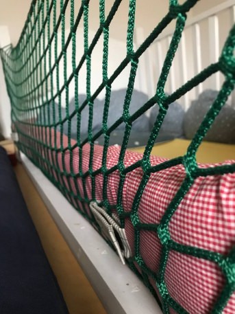 We use the net to secure the upper bunk bed level. The attachment using fender eyes and carabiners works very well because you can remove the net at any time to clean it or remove the mattress. The net dimensions matched the order exactly. In addition, the fender eyes could be installed according to the specified mesh spacing. We are very happy with this solution! translated, original text: "Wir verwenden das Netz zur Sicherung der oberen Stockbett-Ebene. Die Befestigung mittels Fenderösen und Karabiner funktioniert sehr gut, weil man dadurch das Netz jederzeit abnehmen kann, um es zu reinigen oder die Matratze zu entfernen. Die Netz-Abmessungen haben präzise zur Bestellung gepasst. Außerdem könnten die Fenderösen entsprechend dem angegebenem Maschenabstand montiert werden. Wir sind mit dieser Lösung sehr zufrieden!"